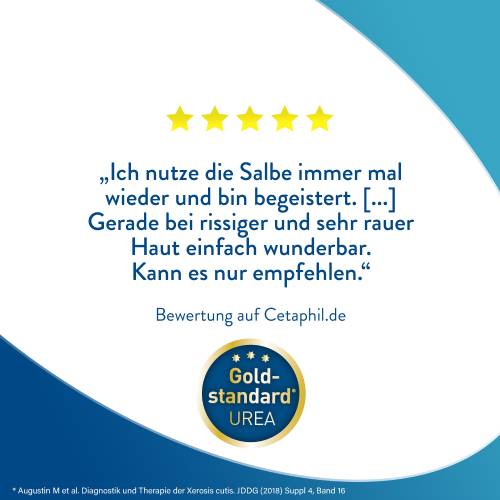 Die wasserfreie Cetaphil PRO Urea 10% Aufbauende Intensiv Fußsalbe enthält einen Feuchtigkeitskomplex aus den natürlichen Feuchthaltefaktoren Urea und Glycerin. In Kombination mit der reichhaltigen, wasserfreien Formel spendet die Fußsalbe der Haut intensive und langanhaltende Feuchtigkeit. Die Haut wird wieder elastisch und geschmeidig und das Erscheinungsbild Ihrer Füße verbessert sich sichtbar – und spürbar. Cetaphil PRO Urea 10% Aufbauende Intensiv Fußsalbe ist frei von Duftstoffen. Sie ist klinisch getestet, auch bei Anwendern mit Diabetes.