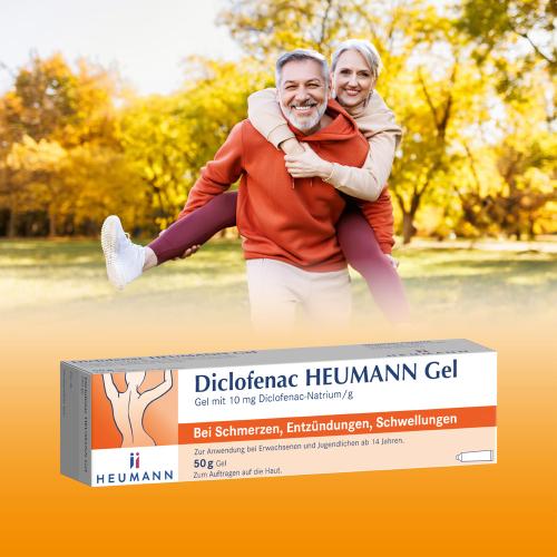 Pflichtangaben: Diclofenac HEUMANN Gel, Gel mit 10 mg Diclofenac-Natrium/g (Wirkstoff: Diclofenac-Natrium). Zur Anwendung bei Erwachsenen und Jugendlichen ab 14 Jahren. Anw.: Bei Erwachsenen zur äußerlichen Behandlung von Schmerzen, Entzündungen und Schwellungen bei: Sport- und Unfallverletzungen (Verstauchungen, Prellungen, Zerrungen); rheumatischen Erkrankungen der Weichteile (Sehnen- und Sehnenscheidenentzündungen, Schleimbeutelentzündungen, Entzündungen im Muskel- und Kapselbereich); degenerativen Erkrankungen der oberen und unteren Gliedmaßen (periphere Extremitätengelenke). Bei Jugendlichen über 14 Jahre zur Kurzzeitbehandlung, zur lokalen, symptomatischen Behandlung von Schmerzen bei akuten Prellungen, Zerrungen oder Verstauchungen infolge eines stumpfen Traumas. Stand: 11/2023.