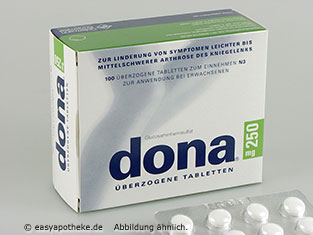 Die Dona 750 mg Tabletten werden zur unterstützenden Behandlung von Arthrose angewendet. Die Tabletten enthalten den natürlichen Wirkstoff Glucosamin. Das Glucosamin wirkt gezielt im Knie, wo es den Schmerz lindert und die Beweglichkeit verbessert, außerdem kommt es zu einer Unterstützung des Knorpelstoffwechsels. Bei einer Arthrose handelt es sich um eine degenerative rheumatische Erkrankung. Bei einer Arthrose ist der Knorpel abgenutzt, so dass seine Oberfläche rau und faserig wird. Die Dona 250 mg Tabletten sind in der Lage die Beschwerden wie Anlaufschmerz, Belastungsschmerz, Gelenkerguss, Schwellung und Schwierigkeiten beim Gehen von Treppen zu lindern.