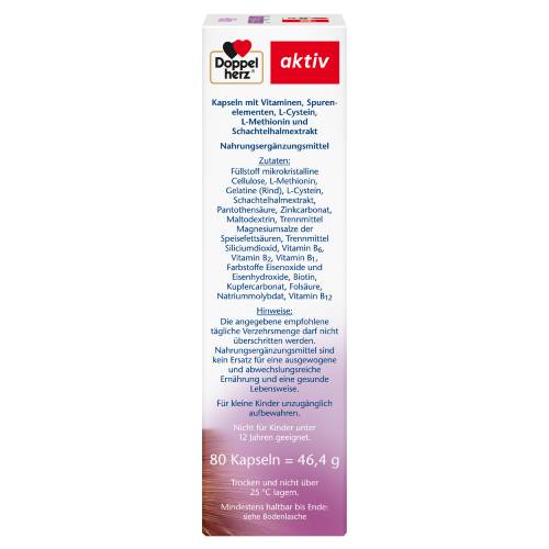 Schönes Haar prägt in der heutigen Zeit das Schönheitsideal unserer Gesellschaft und ist wichtig für unser Wohlbefinden. Wir tun alles, damit unser Haar gut aussieht. Wir föhnen es, wir färben oder bleichen es und verwenden die unterschiedlichsten Styling-Mittel. Doch dadurch strapazieren wir unser Haar auch täglich. Zusätzlich greifen Sonnenbäder oder Salz- und Chlorwasser unser Haar an. Haare erbringen durch Erneuerung bzw. Wachstum täglich Höchstleistungen. Hierfür benötigen sie Nähr- und Aufbaustoffe, die wir über die Nahrung regelmäßig und ausreichend zuführen müssen. Die Kapseln von Doppelherz Haar Intensiv + Biotin kombinieren Vitamine, Spurenelemente, L-Cystein, L-Methionin sowie Schachtelhalmextrakt. Biotin und Zink tragen zum Erhalt normaler Haare bei. Kupfer unterstützt die normale Haarpigmentierung (Haarfarbe). Folsäure spielt wie Vitamin B12 eine Rolle für die Zellteilung. Vitamin B1, Vitamin B2 und Pantothensäure leisten einen Beitrag zum normalen Energiestoffwechsel. Vitamin B6 trägt zu einer normalen Cystein-Synthese bei. Das Spurenelement Molybdän trägt zur Verstoffwechslung schwefelhaltiger Aminosäuren bei. L-Cystein ist eine schwefelhaltige Aminosäure. Sie kommt besonders in den Faserproteinen (Keratin) menschlicher Haare und Nägel vor. L-Methionin ist ebenfalls eine schwefelhaltige Aminosäure. Schachtelhalme (Equisetum arvense) gehören zu den ältesten Pflanzen der Welt.