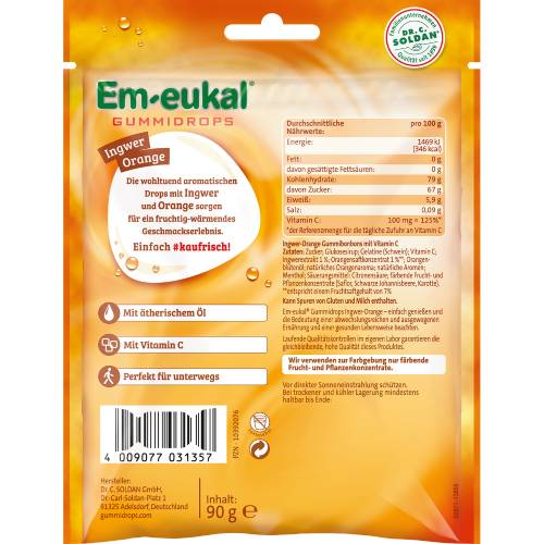 Aromatischer Ingwer vereint mit erfrischender Orange: Die Em-eukal Gummidrops Ingwer-Orange überzeugen als fruchtig-wärmendes Geschmackserlebnis – und laden ein zu extra langem Kaugenuss. Von unseren Bonbonspezialisten zubereitet mit hochwertigen, ätherischen Ölen und in bekannter Dr. C. SOLDAN-Premiumqualität.