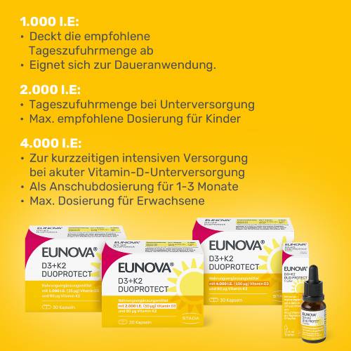 EUNOVA® D3 + K2 DuoProtect – 2.000 I.E. ist die ideale Tageszufuhrmenge bei Unterversorgung für Erwachsene und die maximale Verzehrmenge für Kinder. Sobald die Unterversorgung ausgeglichen ist, kann nach Absprache mit dem Arzt auf 1.000 I.E. zur Daueranwendung umgestellt werden.
