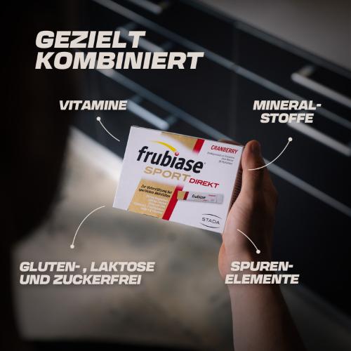 Aus viel Bewegung und Sport resultiert ein erhöhter Mikronährstoffbedarf. Beim Schwitzen gehen außerdem Salze und Mineralstoffe verloren. frubiase® SPORT DIREKT gibt dem Körper zurück, was er beim Sport verbraucht, und deckt den erhöhten Bedarf mit einer ausgewählten Kombination aus Mineralstoffen, Vitaminen und Spurenelementen. Es enthält für Sportler wichtiges Magnesium, Vitamin C, Vitamin E sowie u.a. wertvolle B-Vitamine.