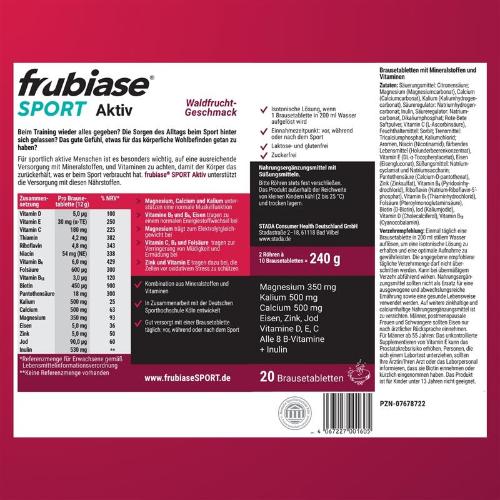 Für sportlich aktive Menschen ist es besonders wichtig, auf eine ausreichende Versorgung mit Nährstoffen zu achten. Um den erhöhten Bedarf zu decken, versorgt das erfrischende Mineralgetränk frubiase® SPORT in den Geschmacksrichtungen Orange und Waldfrucht den Körper mit einer einzigartigen und hochdosierten Kombination aus wichtigen Mineralstoffen, Vitaminen und Spurenelementen. Denn ohne diese Nährstoffe können viele Stoffwechsel-Prozesse im Körper nicht optimal ablaufen. frubiase® SPORT trägt zur Verringerung von Müdigkeit und Ermüdung während des Sports sowie zur Muskelfunktion und dem Energiestoffwechsel bei. Zusätzlich wird das Elektrolytgleichgewicht unterstützt. Gut versorgt mit nur einer Brausetablette täglich.