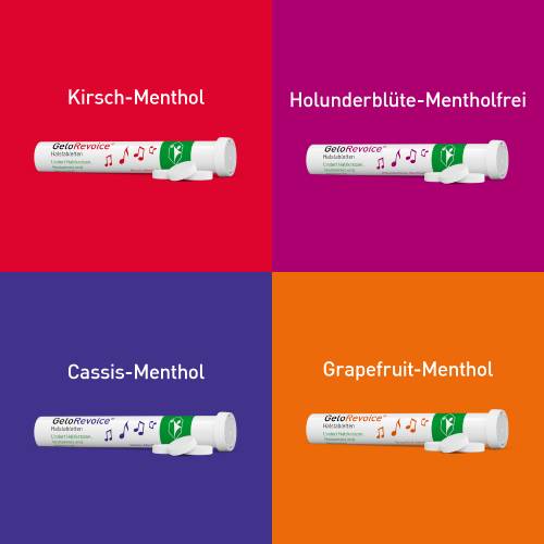 GeloRevoice® gibt es in vier Geschmacksvarianten: fruchtiges Kirsch-Menthol, aromatisches Cassis-Menthol und frisches Grapefruit-Menthol sowie liebliches Holunderblüte-Mentholfrei.