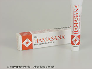 Die Hamasana Salbe wird zur äußerlichen Behandlung von kleinflächigen Hautverletzungen und Entzündungen der Haut angewendet. Die Salbe enthält unter anderem ein Destillat aus Hamamelis. Das enthaltene Destillat wird gewonnen aus den frischen Zweigen und Blättern der Zaubernuss. Der Wirkstoff ist in der Lage den Juckreiz zu stoppen, Entzündungen zu hemmen und kleine Wunden schneller abheilen zu lassen. Es kommt zu einer Abwehr von Bakterien und Pilzen und zu einer Stillung von kleineren Blutungen. Die Hamasana Salbe kann die typischen Symptome von trockener, juckender, schuppiger und medikamentenbelasteter Haut lindern.