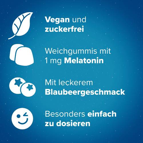 Die Weichgummis mit leckerem Blaubeergeschmack von Ihrem Einschlafexperten Hoggar® tragen dazu bei, die Einschlafzeit zu verkürzen. Sie enthalten Melatonin, Vitamin B6, Baldrian-, Lavendel- und Kamillenextrakt. Die positive Wirkung stellt sich ein, wenn kurz vor dem Schlafengehen 1 mg Melatonin (1 Weichgummi) aufgenommen wird. Das Nahrungsergänzungsmittel** ist zuckerfrei und vegan.