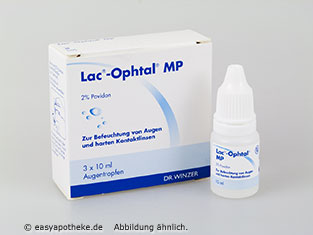 Die Lac Ophtal MP Augentropfen werden zur Behandlung von trockenen Augen aufgrund einer gestörten Produktion der Tränenflüssigkeit angewendet. Die Augentropfen enthalten Wirkstoff Povidon. Beim Povidon handelt es sich um einen sogenannten Filmbildner, welcher die fehlende Tränenflüssigkeit ersetzt. Der Wirkstoff haftet sehr gut an der Horn- und Bindehaut und sorgt dort für eine ausreichende Befeuchtung. Die Lac Ophtal MP Augentropfen schützen die Augenoberfläche vor Irritationen und Reizungen, wie sie zum Beispiel durch den Lidschlag verursacht werden würde.