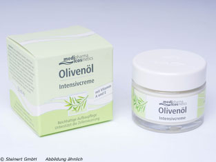 Die Olivenöl Intensivcreme wird zur Pflege von trockener und empfindlicher Gesichtshaut angewendet. Die Creme Olivenöl, Retinol, Panthenol und Vitamin E. Dadurch, dass es sich bei der Creme um eine Wasser in Öl Emulsion handelt verbleiben die pflegenden Öle länger auf der Haut, wodurch die trockene Haut intensiver regeneriert werden können. Das Retinol beschleunigt den Zellerneuerungsprozess der Haut. Die Olivenöl Intensivcreme sorgt dafür, dass die Haut sich weich und geschmeidig anfühlt und schützt sie nachhaltig vor Feuchtigkeitsverlusten.