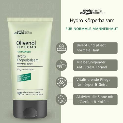 Erleben Sie die belebende Formel des Olivenöl Per Uomo Hydro Körperbalsams von medipharma cosmetics, speziell abgestimmt auf die Bedürfnisse normaler Männerhaut. Der Körperbalsam ist mehr als nur eine Feuchtigkeitspflege – er kümmert sich um die Hautstellen, die durch den Alltag mit Stress, Schmutzpartikeln und häufigem Duschen strapaziert werden.