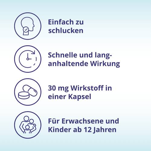 Dextromethorphan, der am besten untersuchte hustenstillende Wirkstoff der Welt, dämpft die Wahrnehmung des Hustenreizes, sodass sich die Schleimhäute in den Bronchien erholen und auch Sie wieder zur Ruhe kommen können. Die leicht zu schluckenden, geschmacksnutralen Silomat® Dextromethorphan Intensiv Hartkapseln sind mit 30mg hochdosiert und wirken bereits nach 15-30 Minuten bis zu 6 Stunden.