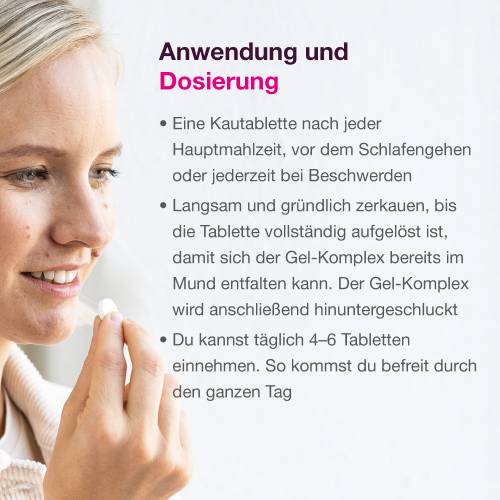 - Eine Kautablette nach jeder Hauptmahlzeit, vor dem Schlafengehen oder jederzeit bei Beschwerden